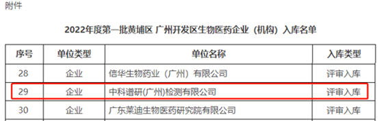 近日,广州市黄埔区科学技术局公布了2022年度第一批生物医药企业(机构)入库名单,共有35家单位成功入库,中科谱研(广州)检测有限公司顺利通过。